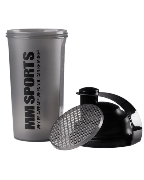 MM Sports Shaker -ravistimessa on osittain läpinäkyvä pullo, jonka ansiosta näet sisällön helposti. Pullon tilavuus on 700 ml ja siinä on selkeä mitta-asteikko, joka helpottaa annostelua. MM Sports Shaker -ravistimessa on musta vesitiivis kierrekorkki, joten voit aina pakata nesteen samaan tilaan treenivaatteiden kanssa. Irrotettava ritilä, joka helpottaa jauheen sekoittamista ja estää paakkujen muodostumisen.