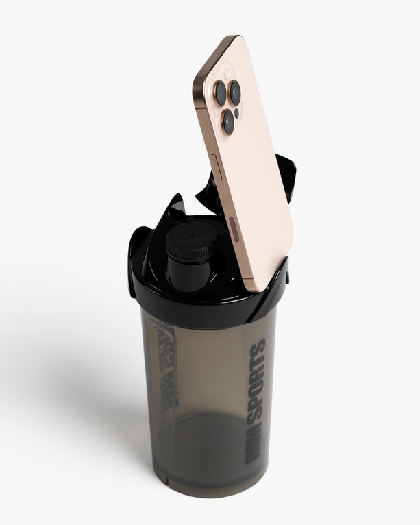 MM Sports Shaker Mobile Stand on shaker, jossa on sisäänrakennettu matkapuhelinteline kannessa. Täydellinen sekä treenitekniikkasi tarkkailuun, että ajanottoon kuvaamisen aikana. Puhelin voi olla pysty- tai vaakasuorassa asennossa. Kannessa on myös säilytystila, johon voit laittaa avaimet, AirPodsit jne. Säilytystilaan voit myös laittaa pienen kierrekorkin esimerkiksi tiskikoneessa pesun aikana, jotta korkki ei katoa.