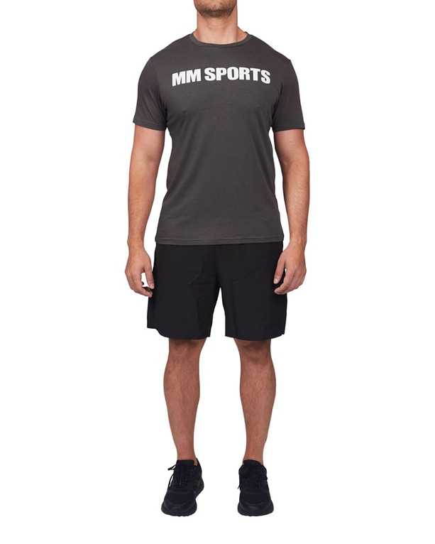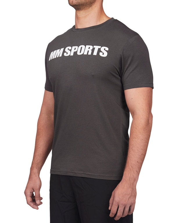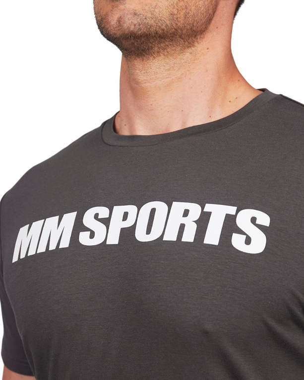 T-paita, jossa on rento tyyli ja istuvuus. T-paidan muoto on suunniteltu korostamaan ylävartaloa, mikä tekee siitä optimaalisen treenin aikana, mutta se sopii tietenkin myös jokapäiväiseen käyttöön. Musta ja tyylikäs MM Sports -logo edessä.
